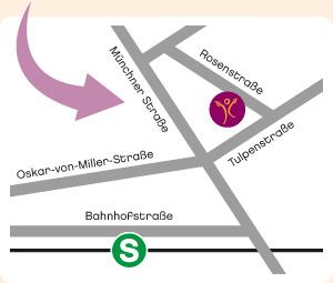 Fast direkt an der B2 München-Augsburg, am Ortsrand von Fürstenfeldbruck, circa 7 Gehminuten von der S4 Haltestelle Fürstenfeldbruck (am Busbahnhof vorbei über die Fußgängerbrücke Richtung Schulzentrum).